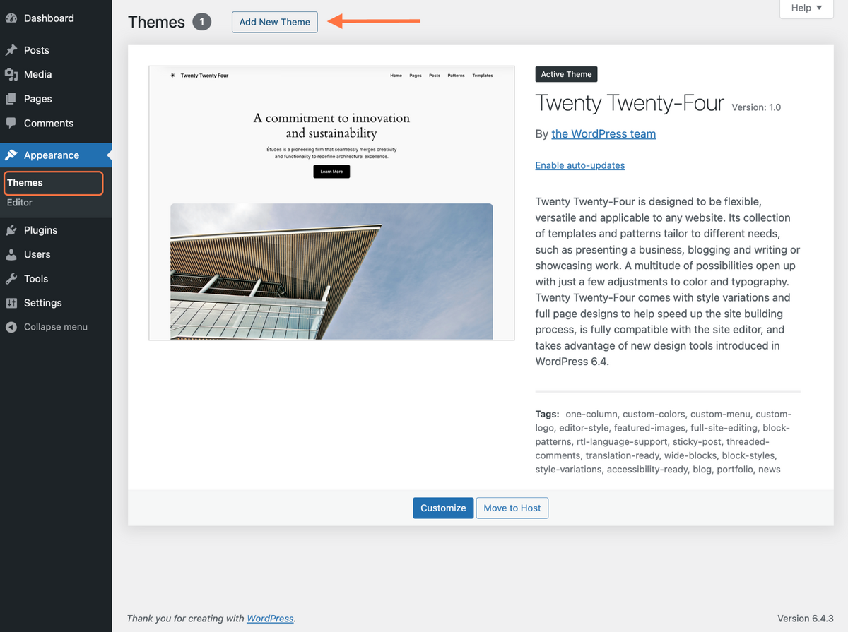 2. Head over to Appearance > Themes, and click on this Add New Theme button.