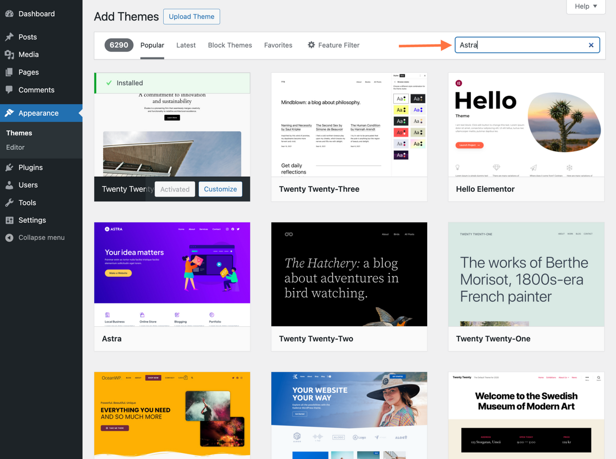3. You can search for the Astra theme through this search bar or upload the theme file directly from your device.