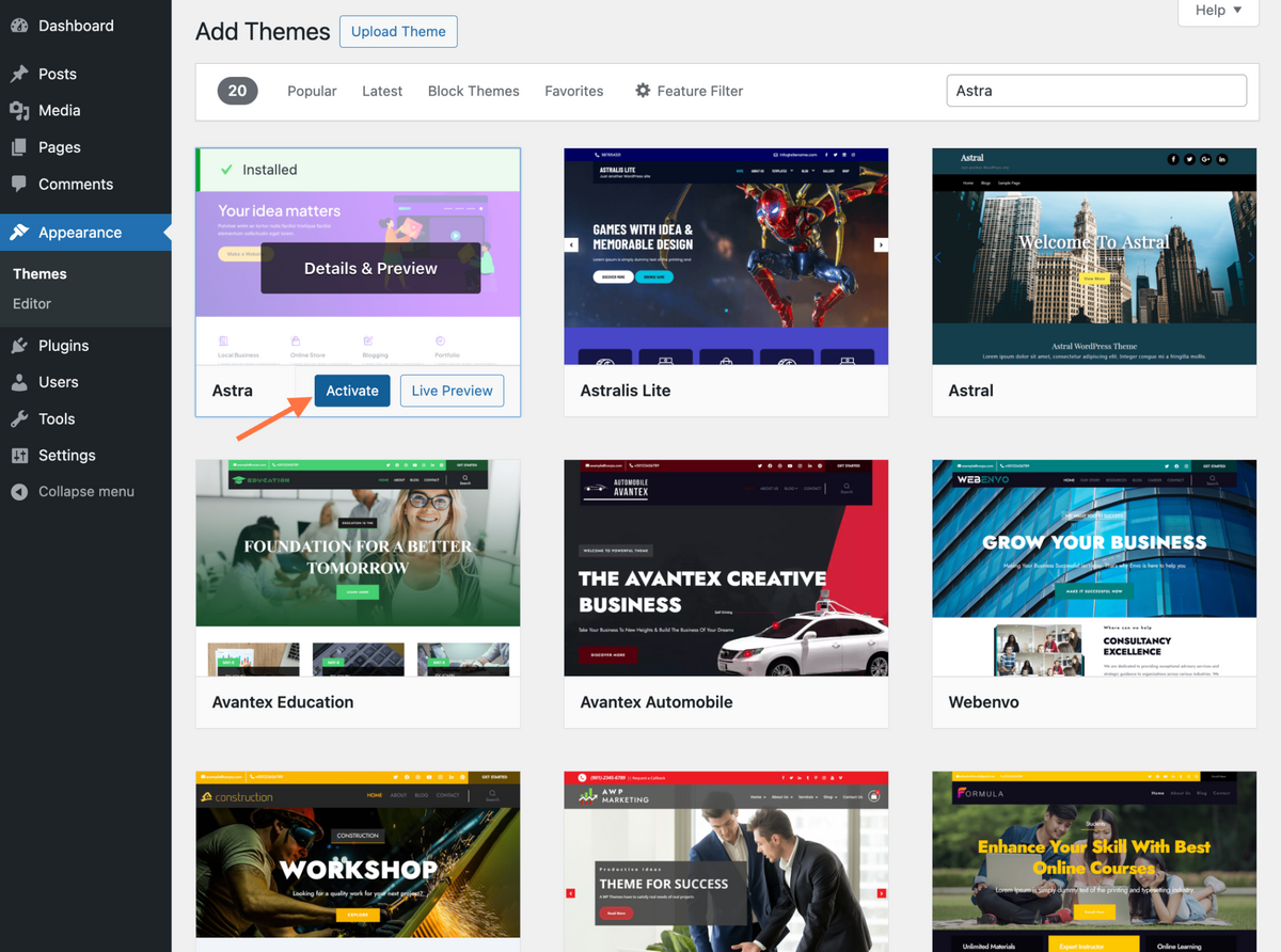 Congratulations! Astra has been successfully installed on your website! You’ll now see a new Astra dashboard option available. Access it to begin customizing your newly installed Astra theme.