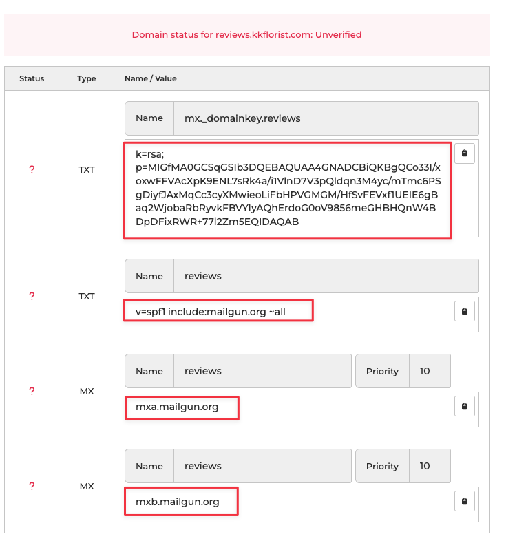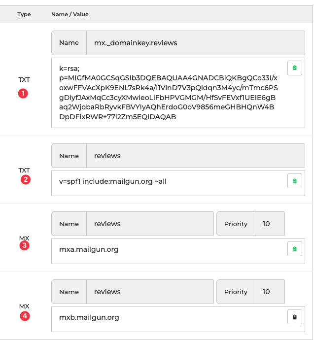 You will need to enter 4 DNS records to set up your sending domain. 2 TXT records and 2 MX records. This allows us to send emails on your behalf.